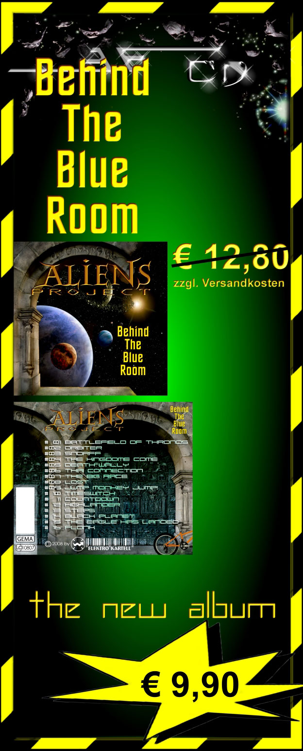 Aliens-Project BEHIND THE BLUE ROOM Bestell-Nr. EKCD-013 Nach den letzten beiden Veröffentlichungen "TheReMinator" und "Kamerun", die beide aus Live-Mitschnitten entstanden sind, war es nun einfach an der Zeit, die Arbeiten aus dem Studio, ebenso zu veröffentlichen. Dieses Album entstand also parallel und völlig unabhängig von den Livegigs, es wurde komplett im Synxss-Studio produziert. Behind the blue Room -die Songs: # 01 Battlefield of Thronos 7:24 # 02 Orbiter 3:16 # 03 Snorff 4:40 # 04 The Kingdome come 3:20 # 05 Death Wally 3:28 # 06 Thai Connection 8:50 # 07 The Big Race 1:05 # 08 Lost 3:38 # 09 Jump Monkey, jump! 5:01 # 10 Timeswitch 5:42 # 11 Countdown 3:24 # 12 Highlander 4:35 # 13 Steps 1:32 # 14 Black Planet 7:34 # 15 The Eagle has landed 5:23 # 16 Flonk 4:31 ca. 74 minuten Spielzeit, 8-seitiges Booklet |